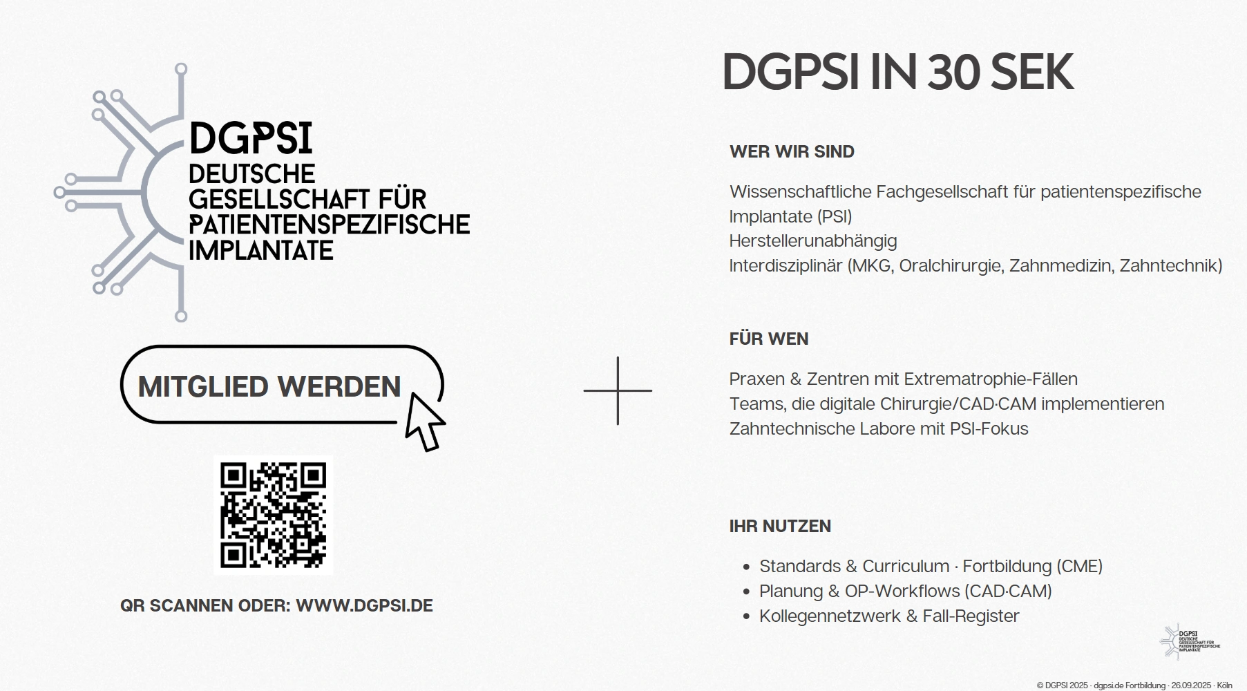 Die DGPSI versteht sich als herstellerunabhängige, interdisziplinäre Fachgesellschaft für MKG-Chirurg:innen, Oralchirurg:innen und Zahntechniker:innen. Mitglieder profitieren von einem Fall-Register, Fortbildungs-Curricula und einem starken Netzwerk.